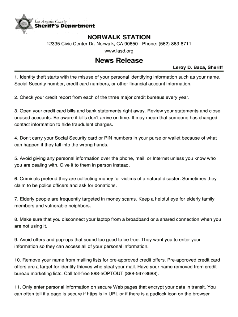 NORWALK STATION 12335 Civic Center Dr. Norwalk, CA 90650 Phone: (562) 8638711 www.lasd.orgNews Release Leroy D. Back, Sheriff 1. Identity theft starts with the misuse of your personal identifying
