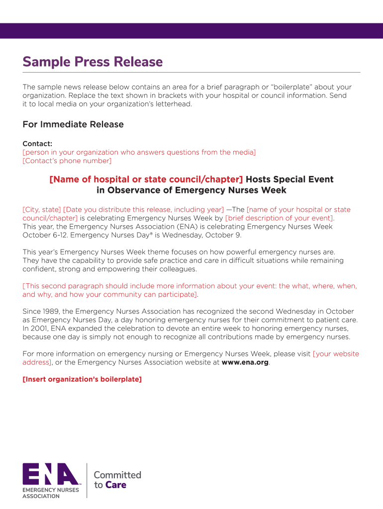 Sample Press Release The sample news release below contains an area for a brief paragraph or boilerplate about your organization. Replace the text shown in brackets with your hospital or council information.