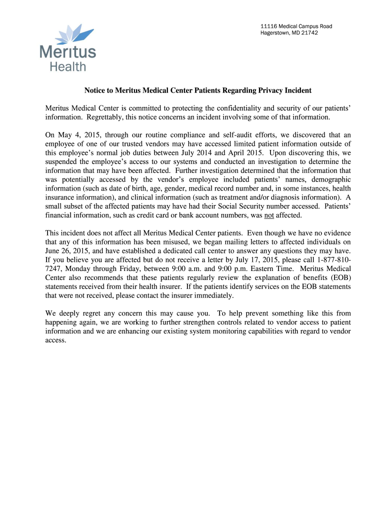 Hagerstown, MD 21742Notice to Merits Medical Center Patients Regarding Privacy Incident