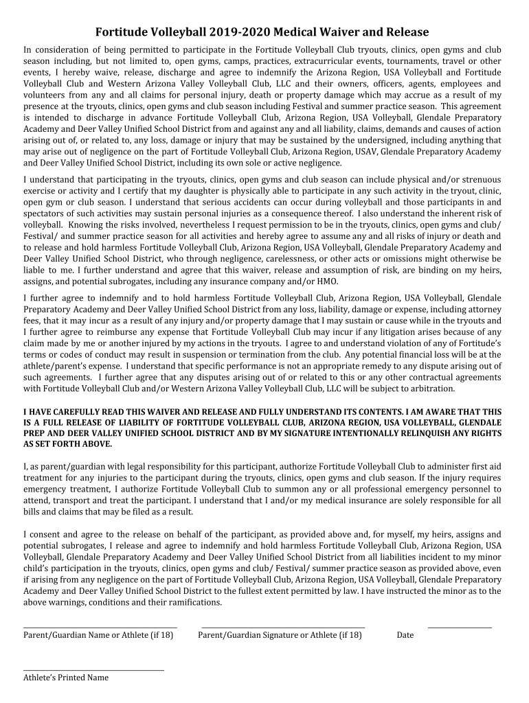 Fortitude Volleyball 20192020 Medical Waiver and Release