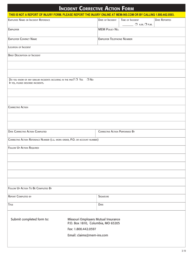 Incident Corrective Action Form THIS IS NOT A REPORT OF INJURY FORM. PLEASE REPORT THE INJURY ONLINE AT MEMINS.COM OR BY CALLING 1.800.442.0593. Employee Name or Incident Reference Date of Incident