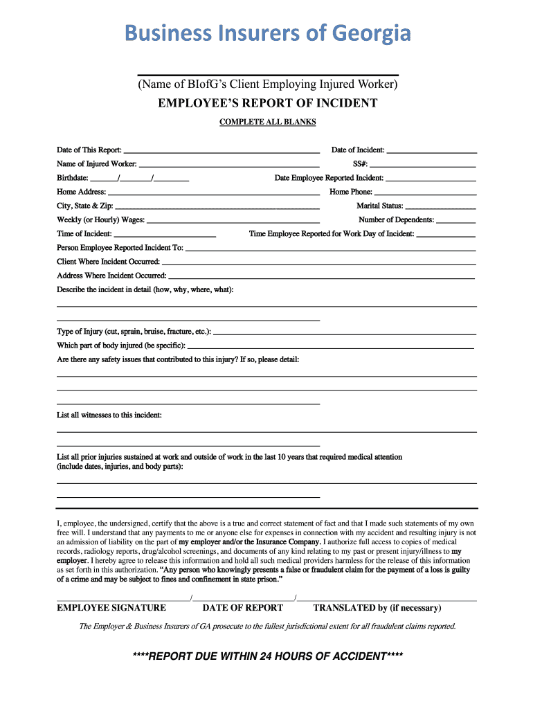 Business Insurers of Georgia (Name of Blogs Client Employing Injured Worker) EMPLOYEES REPORT OF INCIDENT COMPLETE ALL BLANKS Date of This Report: Date of Incident: Name of Injured Worker: SS#: Birthdate: