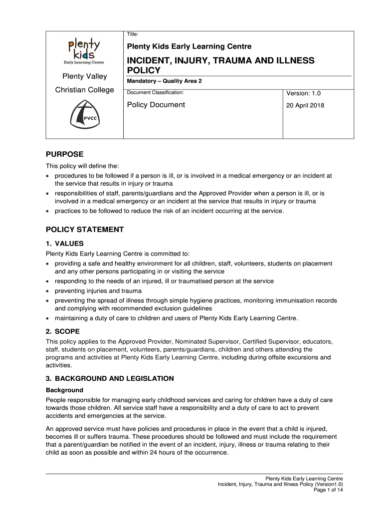 Title:Plenty Kids Early Learning CentrePlenty Valley Christian CollegeINCIDENT, INJURY, TRAUMA AND ILLNESS POLICY Mandatory Quality Area 2 Document Classification:Version: 1.0Policy Document20 April