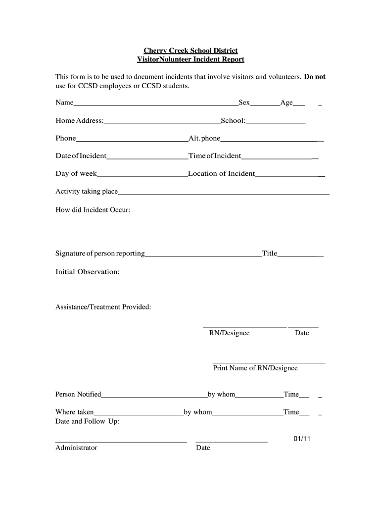 Cherry Creek School District VisitorNolunteer Incident Report This form is to be used to document incidents that involve visitors and volunteers. Do not use for CCD employees or CCD students. NameSexHome