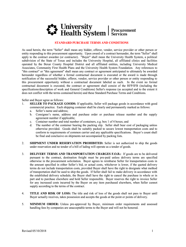 A University V Health SystemProcurement ServicesSTANDARD PURCHASE TERMS AND CONDITIONS As used herein, the term “Seller shall mean any bidder, offer or, vendor, service provider or other person