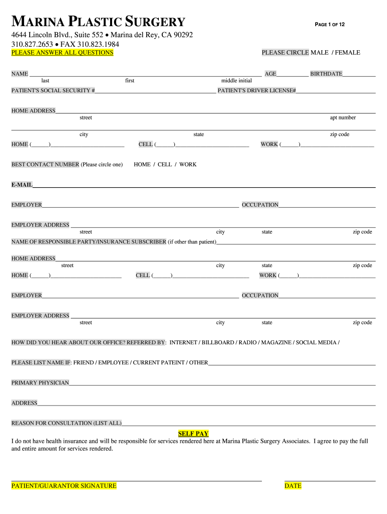 MARINA PLASTIC SURGERYPAGE 1 OF 124644 Lincoln Blvd., Suite 552 Marina del Rey, CA 90292 310.827.2653 FAX 310.823.1984 PLEASE ANSWER ALL QUESTIONSPLEASE CIRCLE MALE / FEMALENAMEAGE lastfirstBIRTHDATEmiddle