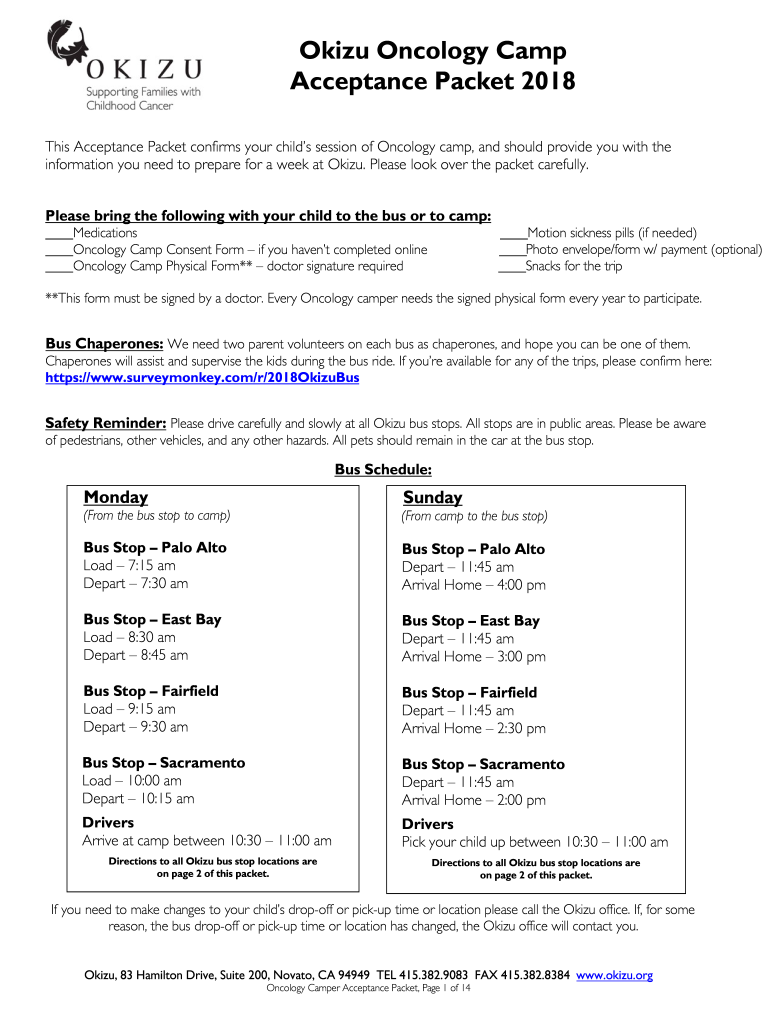 OKing Oncology Camp Acceptance Packet 2018 This Acceptance Packet confirms your children session of Oncology camp, and should provide you with the information you need to prepare for a week at OKing.