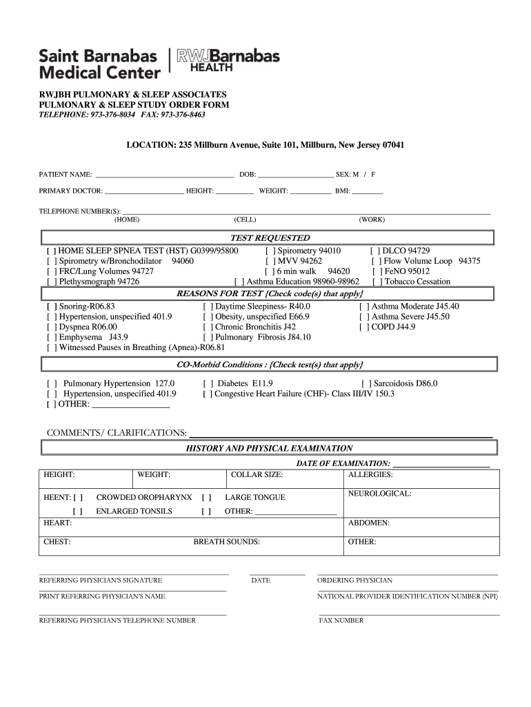 Get the free RWJBH Pulmonary and SleepHST order form. RWJBH Pulmonary and SleepHST order form