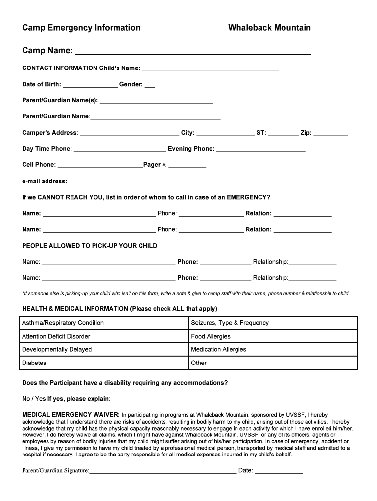 Camp Emergency InformationWhaleback Mountaintop Name: CONTACT INFORMATION Child's Name: Date of Birth: Gender: Parent/Guardian Name(s): Parent/Guardian Name: Campers Address: City: ST: Zip: Day Time