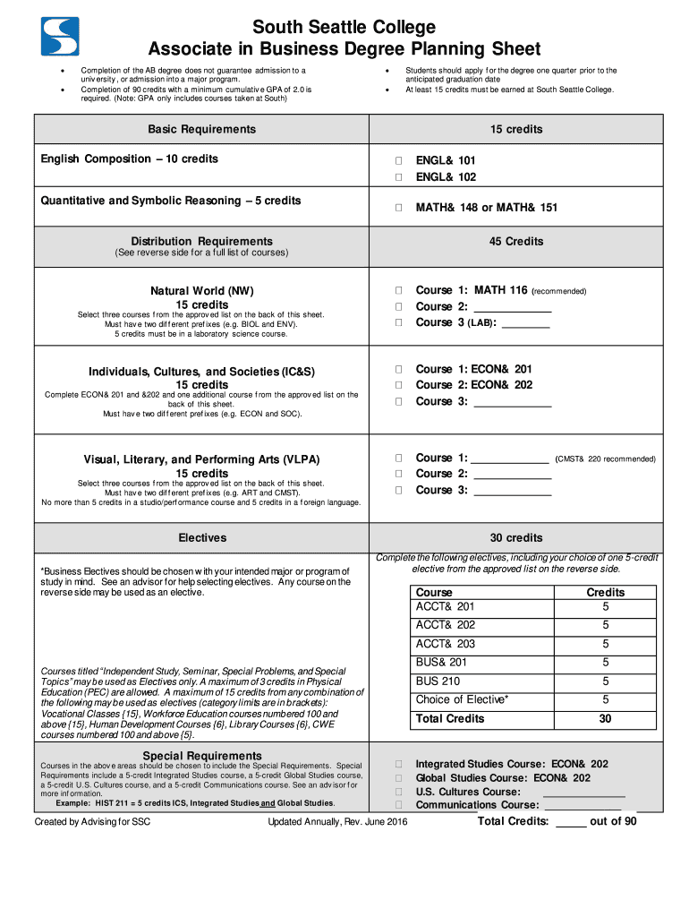 South Seattle College Associate in Business Degree Planning Sheet Completion of the AB degree does not guarantee admission to a university, or admission into a major program. Completion of 90 credits