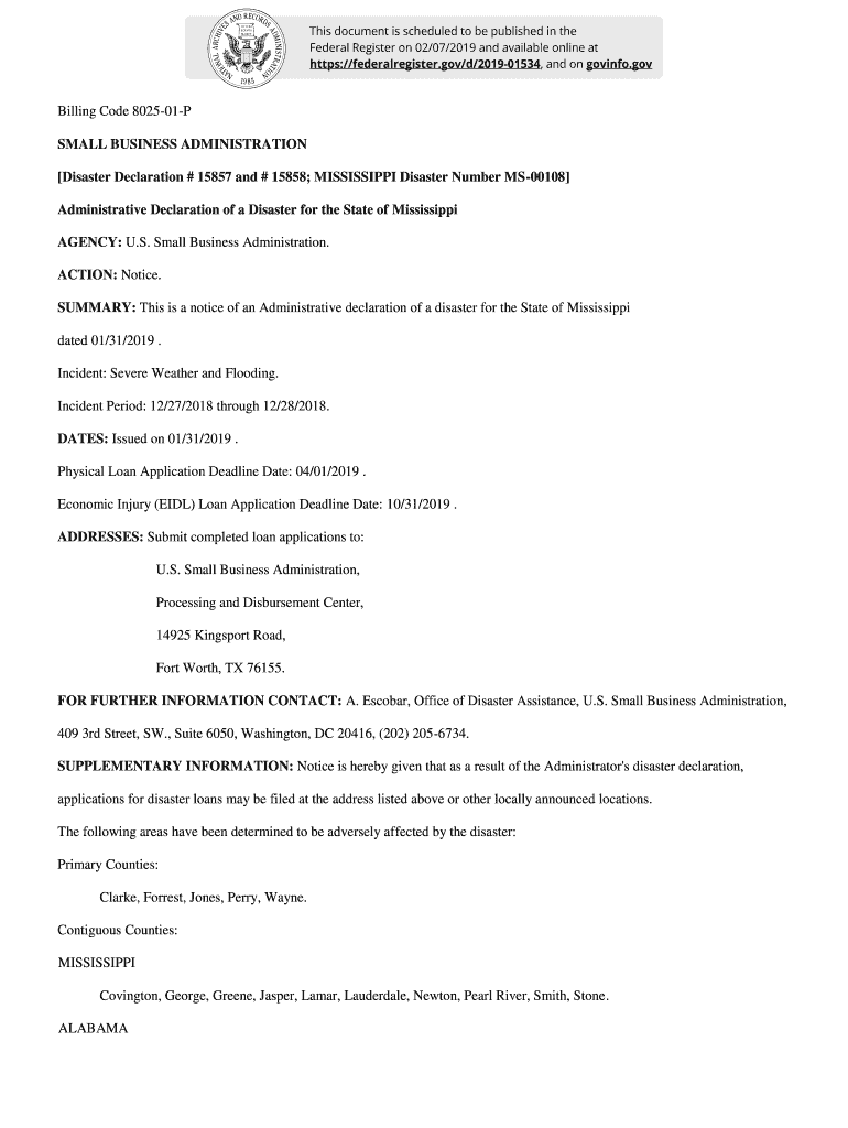 This document is scheduled to be published in the Federal Register on 02/07/2019 and available online at https://federalregister.gov/d/201901534, and on gov info. Billing Code 802501P SMALL BUSINESS