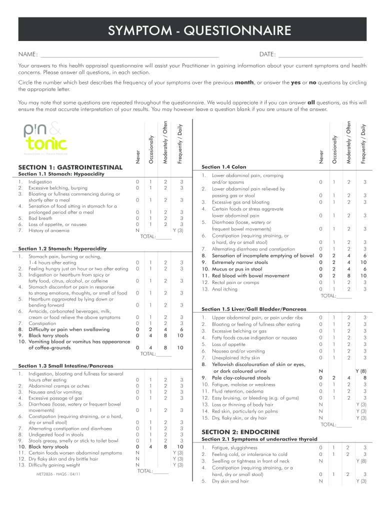 SYMPTOM QUESTIONNAIRE NAME: DATE: Your answers to this health appraisal questionnaire will assist your Practitioner in gaining information about your current symptoms and health concerns. Please answer