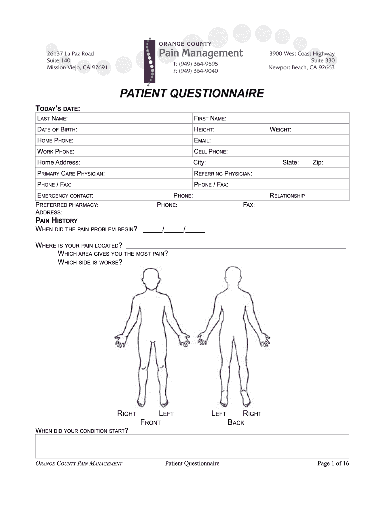 PATIENT QUESTIONNAIRE TODAY IS DATE: LAST NAME:FIRST NAME:DATE OF BIRTH:HEIGHT:HOME PHONE:EMAIL:WORK PHONE:CELL PHONE:Home Address:City:PRIMARY CARE PHYSICIAN:REFERRING PHYSICIAN:PHONE / FAX:PHONE