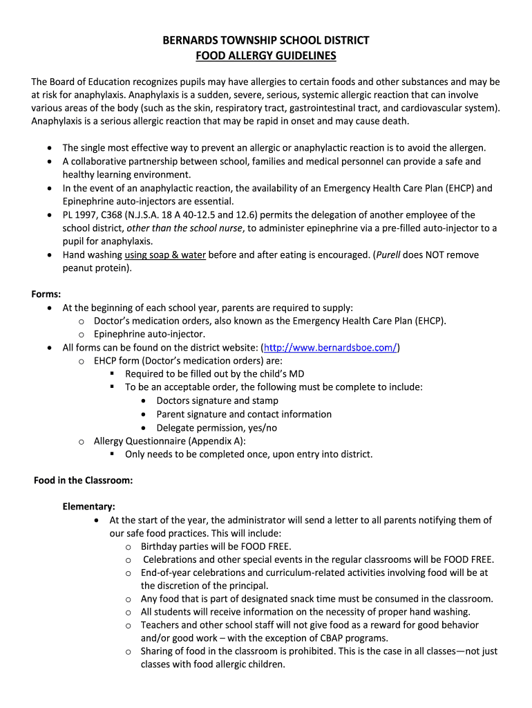 BERNARD TOWNSHIP SCHOOL DISTRICT FOOD ALLERGY GUIDELINES The Board of Education recognizes pupils may have allergies to certain foods and other substances and may be at risk for anaphylaxis. Anaphylaxis