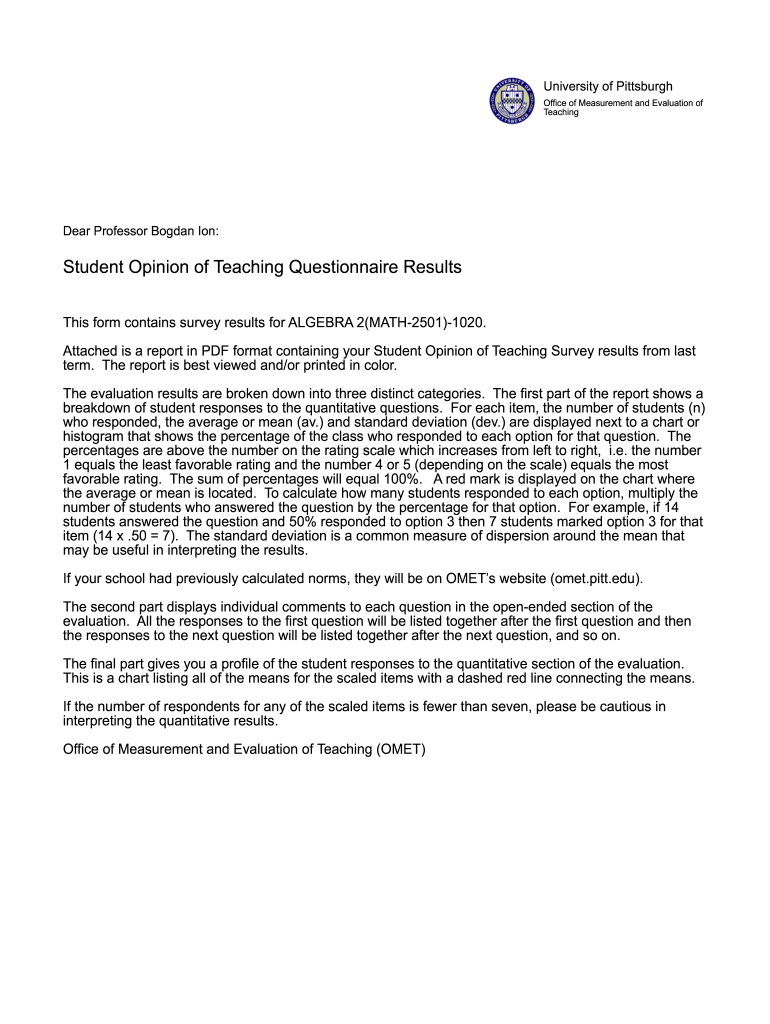 TeachingDear Professor Bogdan Ion:Student Opinion of Teaching Questionnaire Results