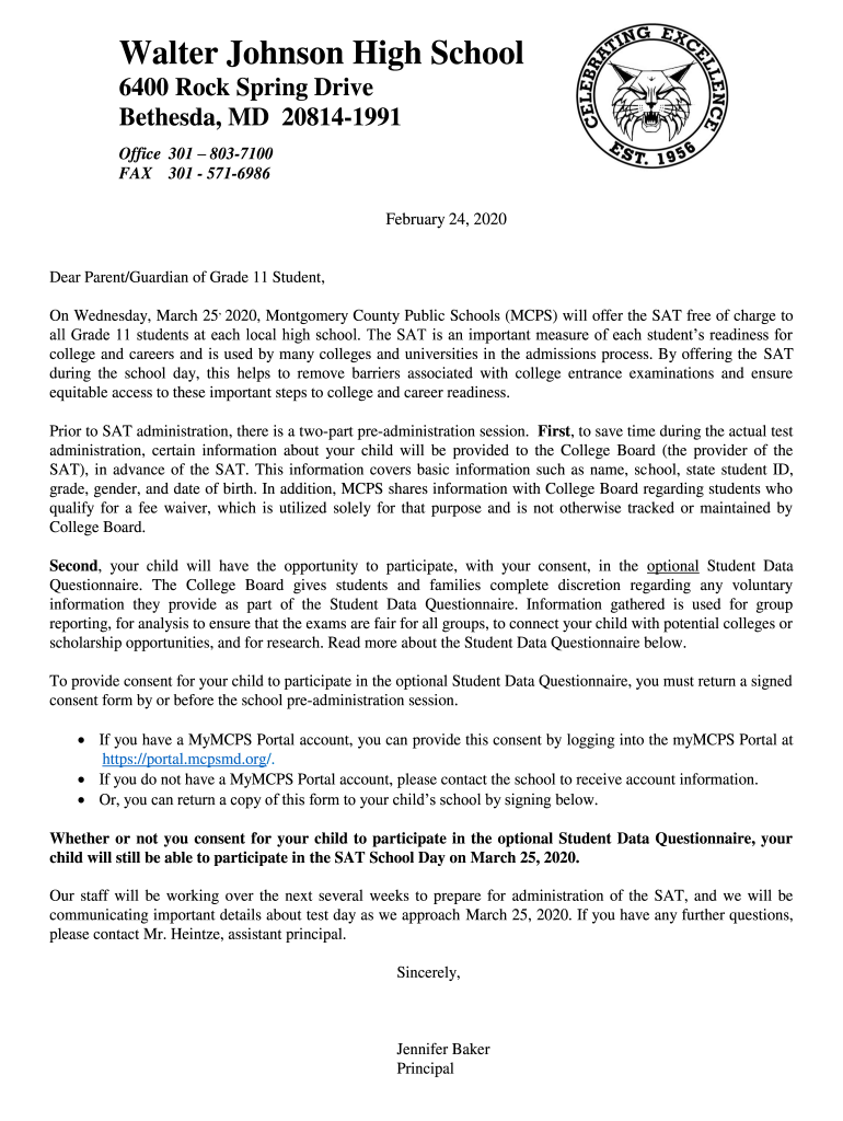 Walter Johnson High School 6400 Rock Spring Drive Bethesda, MD 208141991 Office 301 8037100 FAX 301 5716986 February 24, 2020Dear Parent/Guardian of Grade 11 Student, On Wednesday, March 25, 2020,
