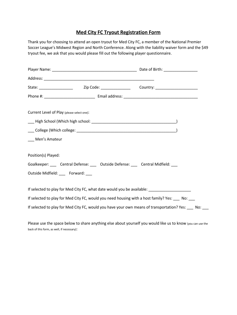 Med City FC Tryout Registration Form Thank you for choosing to attend an open tryout for Med City FC, a member of the National Premier Soccer Leagues Midwest Region and North Conference. Along with
