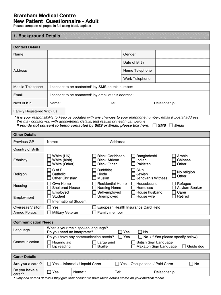 Graham Medical Center New Patient Questionnaire Adult Please complete all pages in full using block capitals1. Background Details Contact Details Nameserver Date of BirthAddressHome Telephone Work