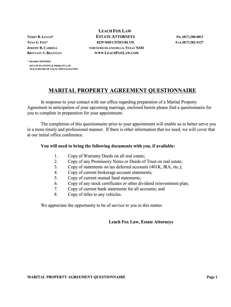 TERRY R. LEACH* TEN G. FOX* JEREMY R. CARROLL BRITTANY N. BRANTLEYLEACH FOX LAW ESTATE ATTORNEY SPH. (817) 28008118229 MID CITIES BLVD.FAX (817) 2824127NORTH RICHLAND HILLS, TEXAS 76182WWW.LEACHFOXLAW.COM*