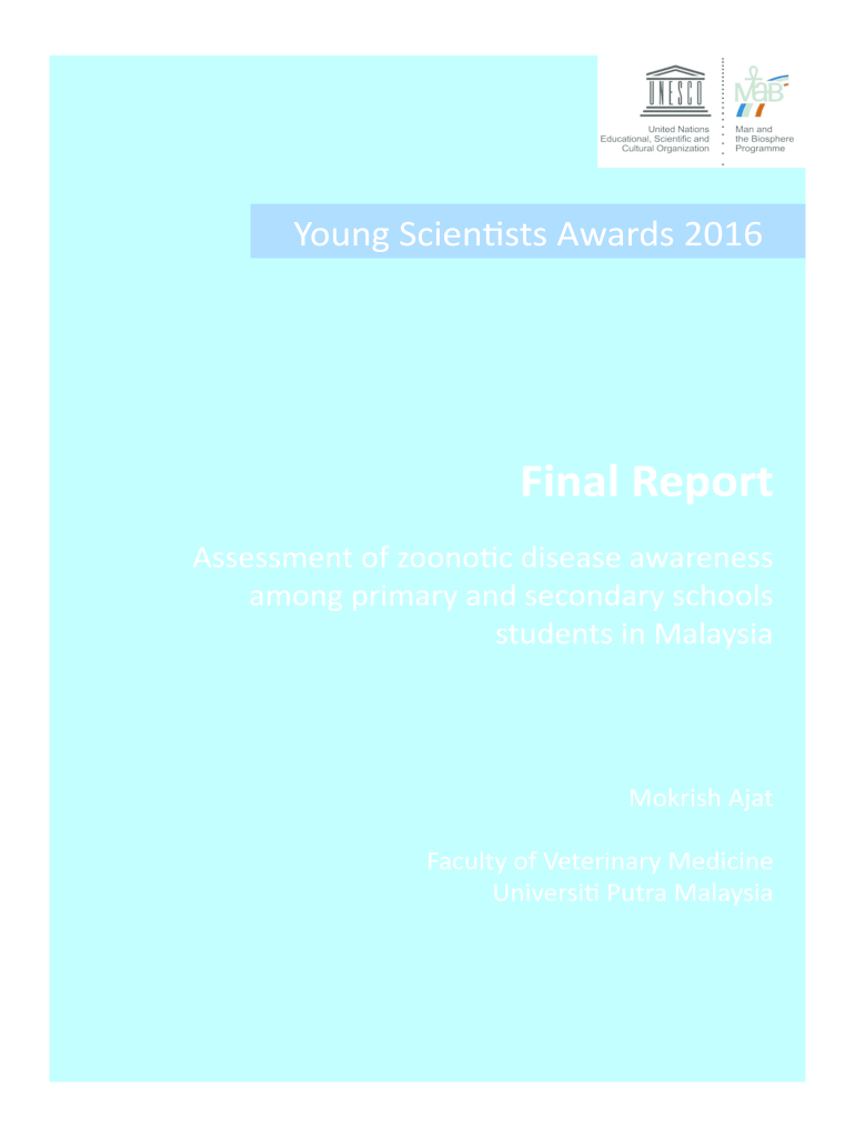 Young Scion+STS Awards 2016Final ReportAssessment of zoo no+c disease awareness among primary and secondary schools students in MalaysiaMokrish AjatFaculty of Veterinary MedicineUniversi+ Petra Malaysians report was submitted to MAY UNESCO Young Scion+STS Awards committee.