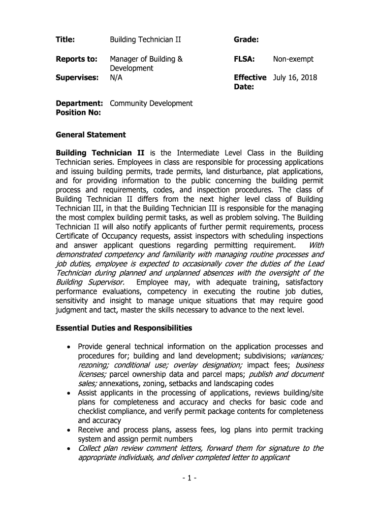Title:Building Technician Grade:Reports to:Manager of Building & Development N/AFSSA:Supervises:NonexemptEffective July 16, 2018, Date:Department: Community Development Position No: General Statement
