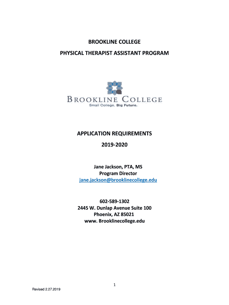 BROOKLINE COLLEGE PHYSICAL THERAPIST ASSISTANT PROGRAMAPPLICATION REQUIREMENTS 20192020Jane Jackson, PTA, MS Program Director Jane. Jackson brooklinecollege.edu6025891302 2445 W. Dunlap Avenue Suite
