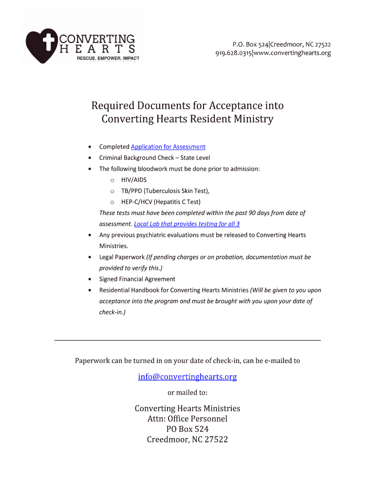 P.O. Box 524 Creed moor NC 27522 P.O. Box 524 Creed moor, NC 27522 919.628.0315 www.convertinghearts.orgRequired Documents for Acceptance into Converting Hearts Resident Ministry Completed Application