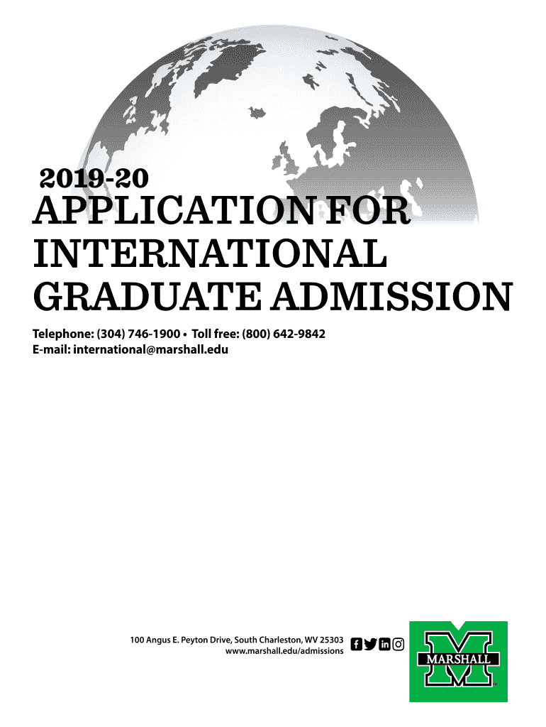 201920APPLICATION FOR INTERNATIONAL GRADUATE ADMISSION Telephone: (304) 7461900 Toll free: (800) 6429842 Email: international Marshall.edu100 Angus E. Peyton Drive, South Charleston, WV 25303 www.marshall.edu/admissionsMarshall