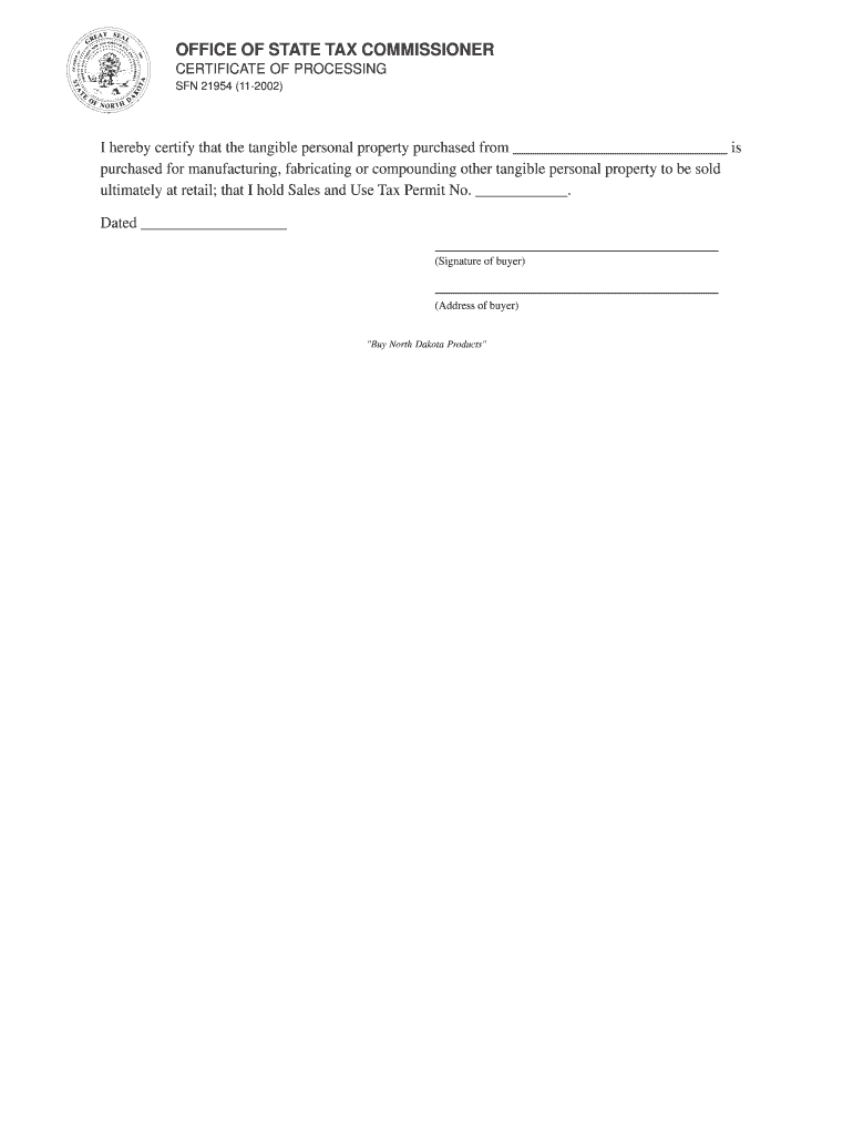 OFFICE OF STATE TAX COMMISSIONER CERTIFICATE OF PROCESSING SON 21954 (11-2002) I hereby certify that the tangible personal property purchased from is purchased for manufacturing, fabricating or compounding