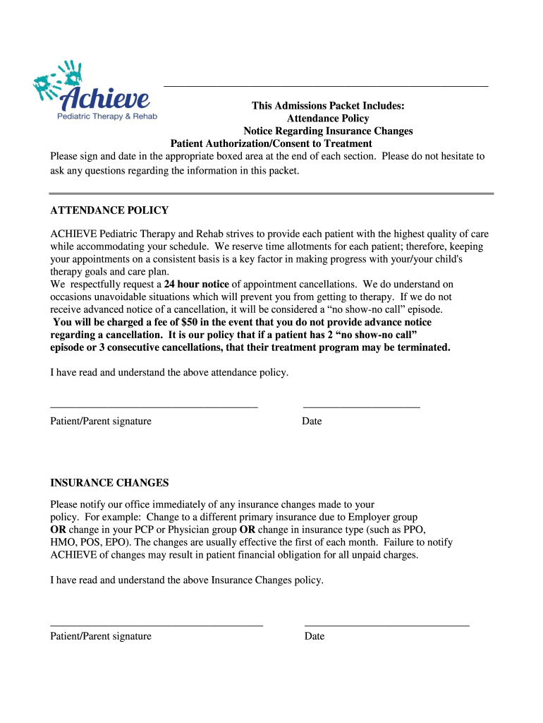 This Admissions Packet Includes: Attendance Policy Notice Regarding Insurance Changes Patient Authorization/Consent to Treatment Please sign and date in the appropriate boxed area at the end of each