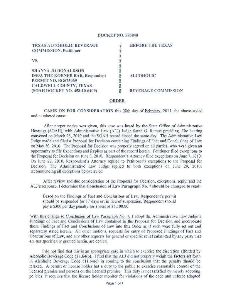 DOC RET NO, 585840 T E S ALCOHOL C BEVERAGE E C Ol'(will ION. Petitioner V ', 1IA 1 A.TO DO ALD ON D/B/A l 1lE O RL R 8AR Respondent 'PERMIT l O. BG 675069 CALDWELL COUNT Y, T ERA. (SO A II DOCKET