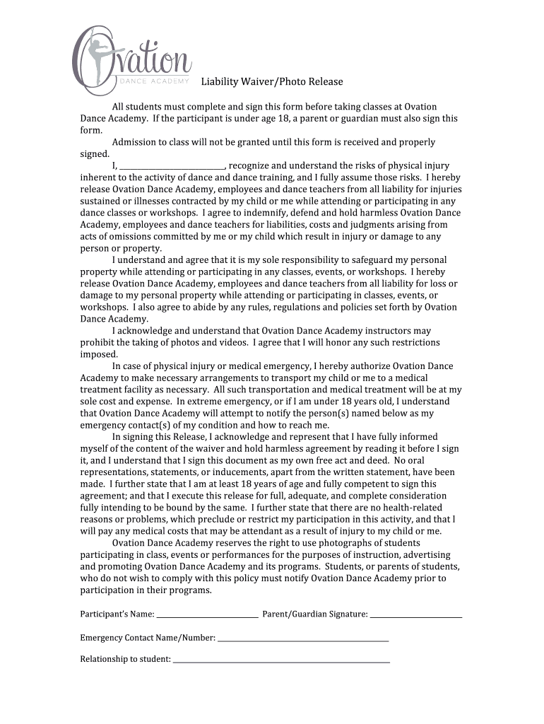 Liability Waiver/Photo Released students must complete and sign this form before taking classes at OvationDance Academy. If the participant is under age 18, a parent or guardian must also sign this