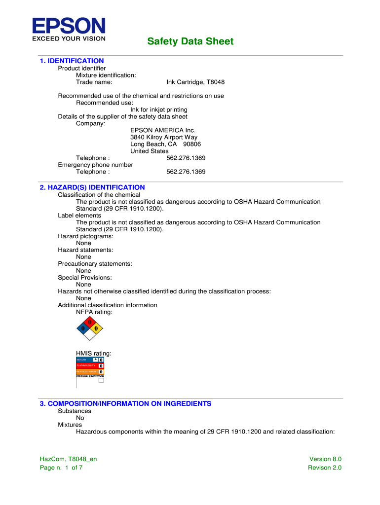Trade name:Ink Cartridge, T8048Recommended use of the chemical and restrictions on use