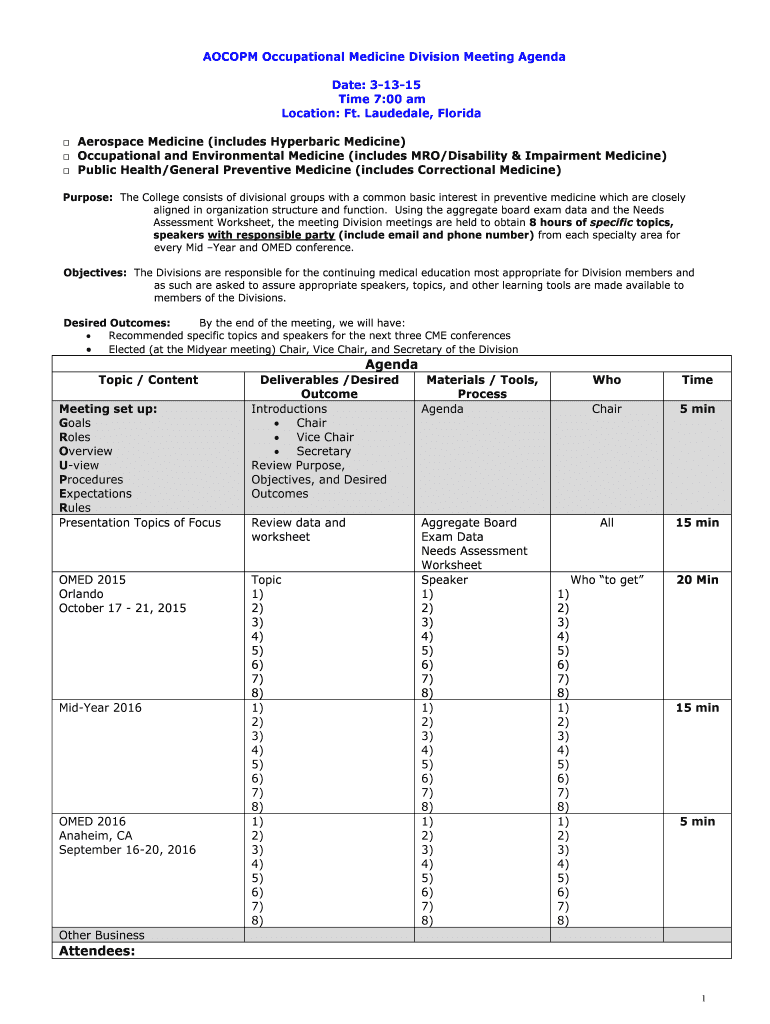 AOC OPM Occupational Medicine Division Meeting Agenda Date: 31315 Time 7:00 am Location: Ft. Lauded ale, Florida Aerospace Medicine (includes Hyperbaric Medicine) Occupational and Environmental Medicine