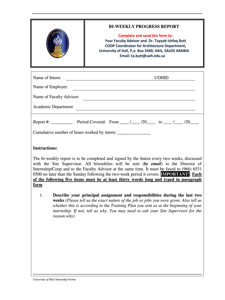 BIWEEKLY PROGRESS REPORT Complete and send this form to: Your Faculty Advisor and Dr. Tanya Ishtar Butt COOP Coordinator for Architecture Department, University of Hail, P.o. Box 2440, HAIL, SAUDI