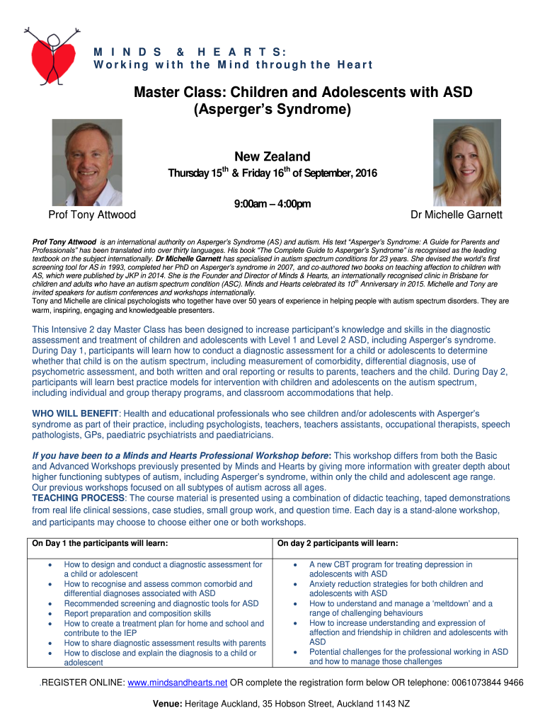 M I N D S & H E A R T S: W o r k i NG w i TH the M ind through the H ear master Class: Children and Adolescents with ASD (Asperger's Syndrome) New Zealand Thursday 15 & Friday 16th of September 2016