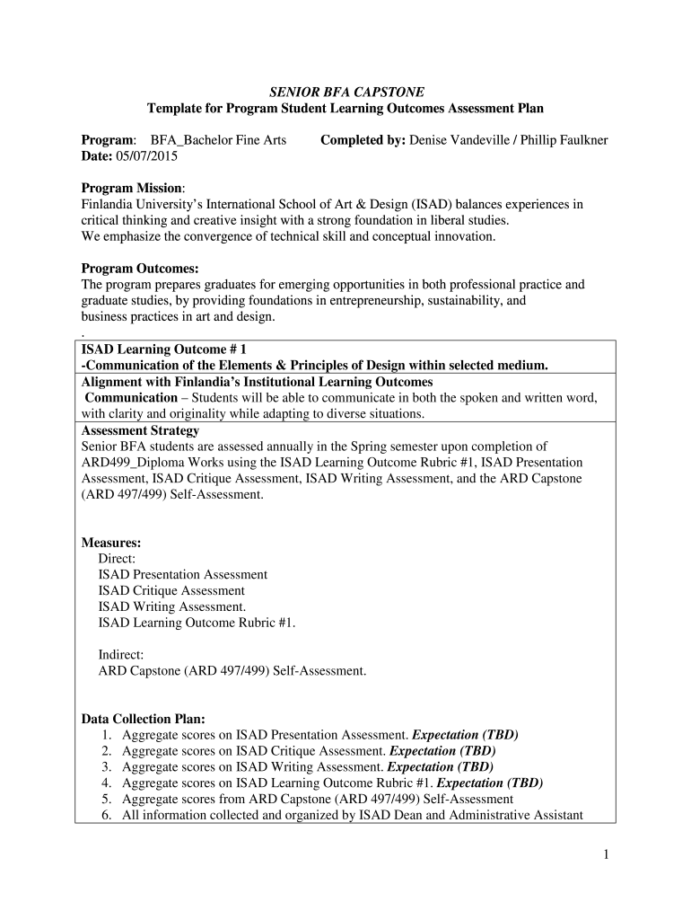 SENIOR BFA CAPSTONE Template for Program Student Learning Outcomes Assessment Plan Program: BFA Bachelor Fine Arts Date: 05/07/2015Completed by: Denise Vaudeville / Phillip FaulknerProgram Mission:
