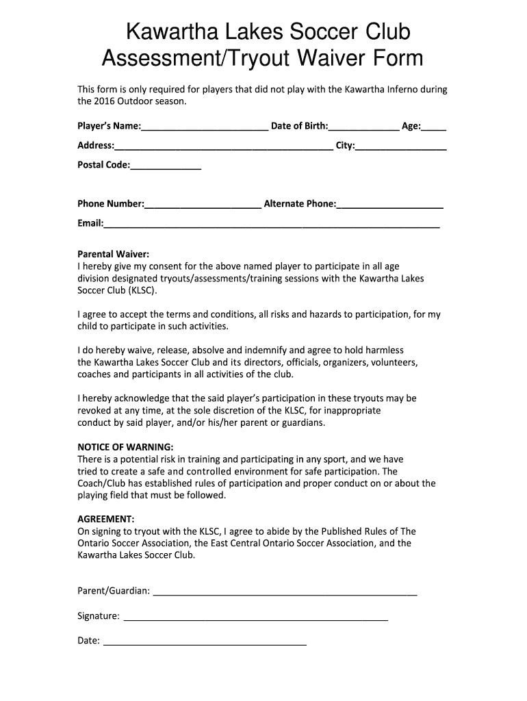Kawartha Lakes Soccer Club Assessment/Tryout Waiver Form This form is only required for players that did not play with the Martha Inferno during the 2016 Outdoor season. Players Name: Date of Birth: