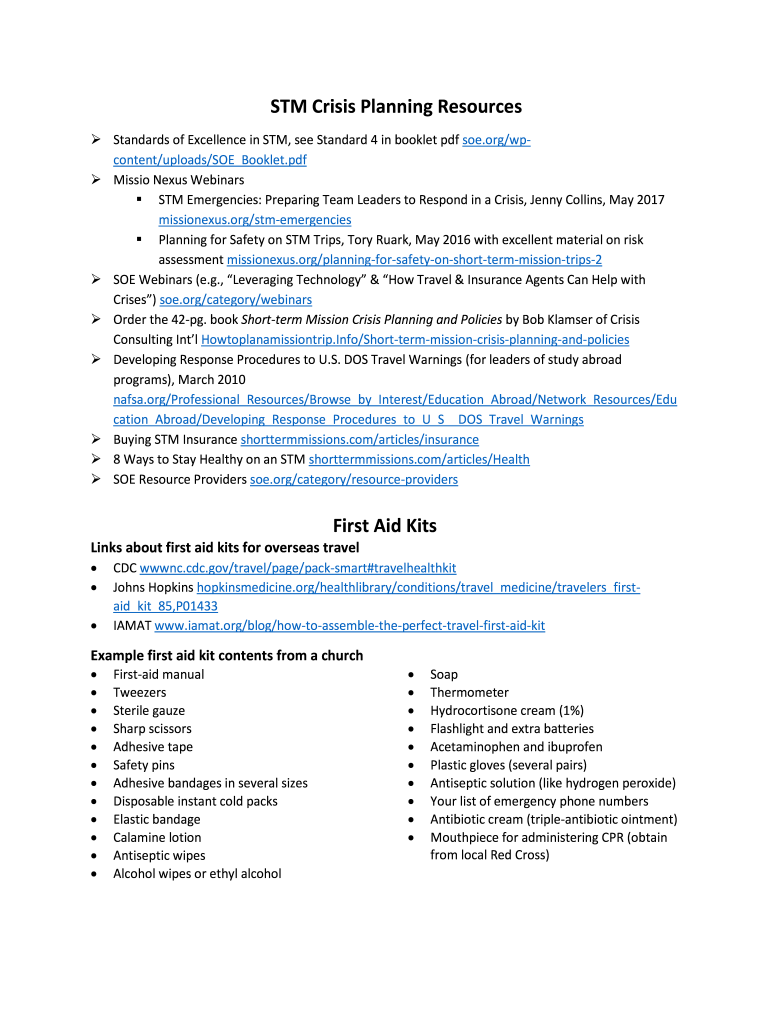 STM Crisis Planning Resources Standards of Excellence in STM, see Standard 4 in booklet PDF soe.org/wpcontent/uploads/SOE Booklet.pdf Mission Nexus Webinars STM Emergencies: Preparing Team Leaders