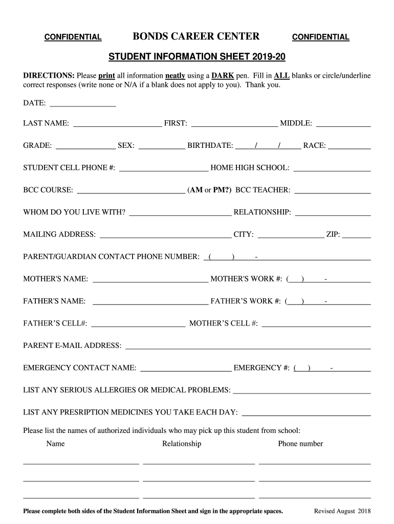 BONDS CAREER CENTERCONFIDENTIALCONFIDENTIALSTUDENT INFORMATION SHEET 201920
