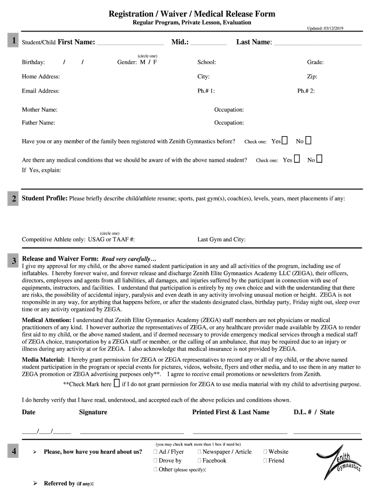 Registration / Waiver / Medical Release Form Regular Program, Private Lesson, Evaluation Updated: 03/12/20191Student/Childbirth Name: Mid.: Last Name: (circle one)Birthday://Gender: M / School:Grade:Home