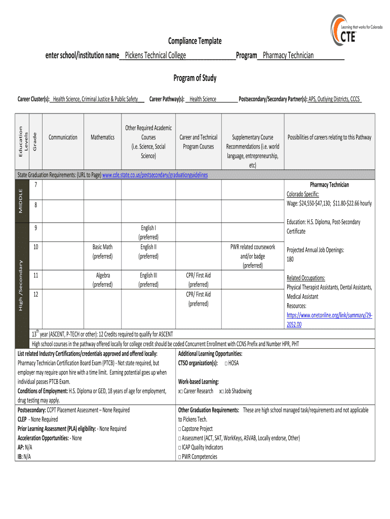 Compliance Template enter school/institution name Pickens Technical College Program Pharmacy Technician Program of StudyGradeEducation LevelsCareer Cluster(s): Health Science, Criminal Justice & Public