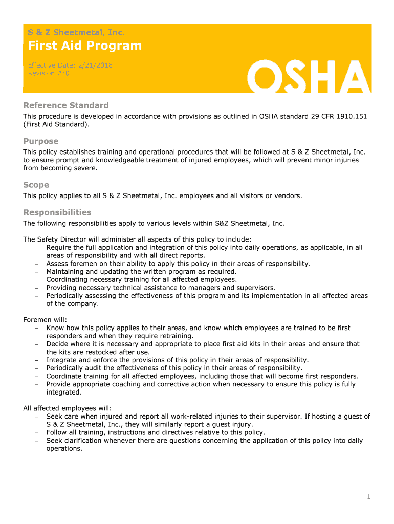 S & Z Sheet metal, Inc. First Aid Program Effective Date: 2/21/2018 Revision #:0Reference Standard This procedure is developed in accordance with provisions as outlined in OSHA standard 29 CFR 1910.151