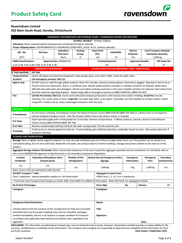 Product Safety Card Ravens down Limited 292 Main South Road, Horny, Christchurch EMERGENCY INFORMATION AND STORAGE GUIDE / DANGEROUS GOODS DECLARATION SERIAL DOUBLE fertilizer additive Substance: