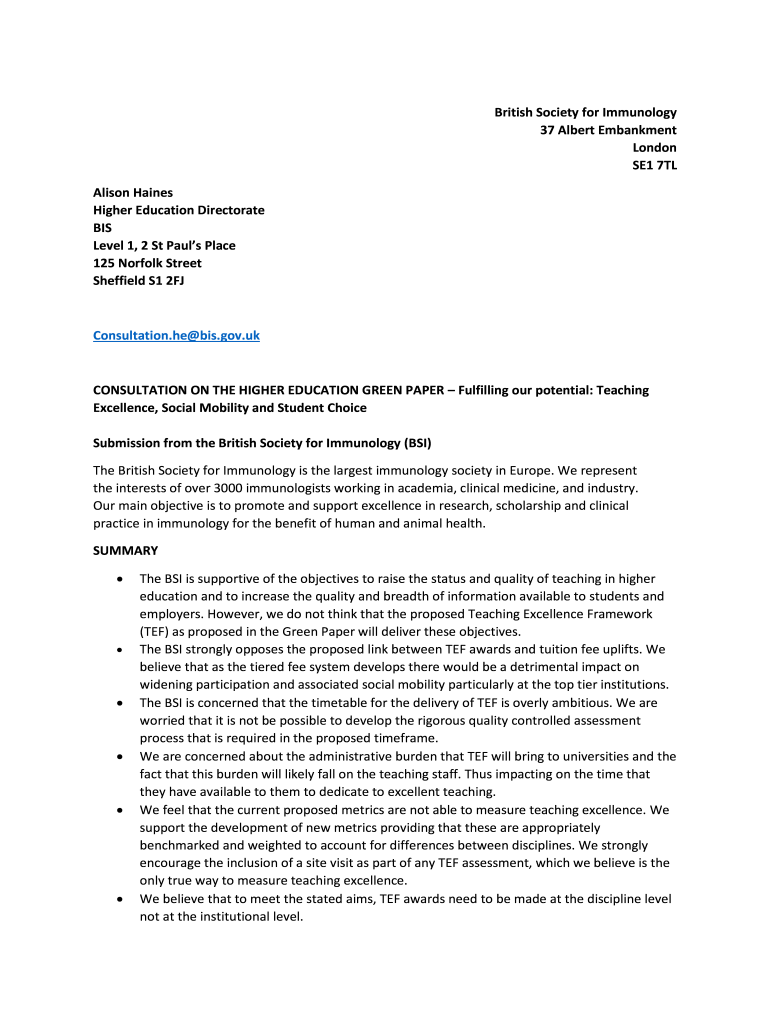 British Society for Immunology 37 Albert Embankment London SE1 7TL Alison Haines Higher Education Directorate BIS Level 1, 2 St Paul's Place 125 Norfolk Street Sheffield S1 2FJConsultation. He bis.gov.consultation