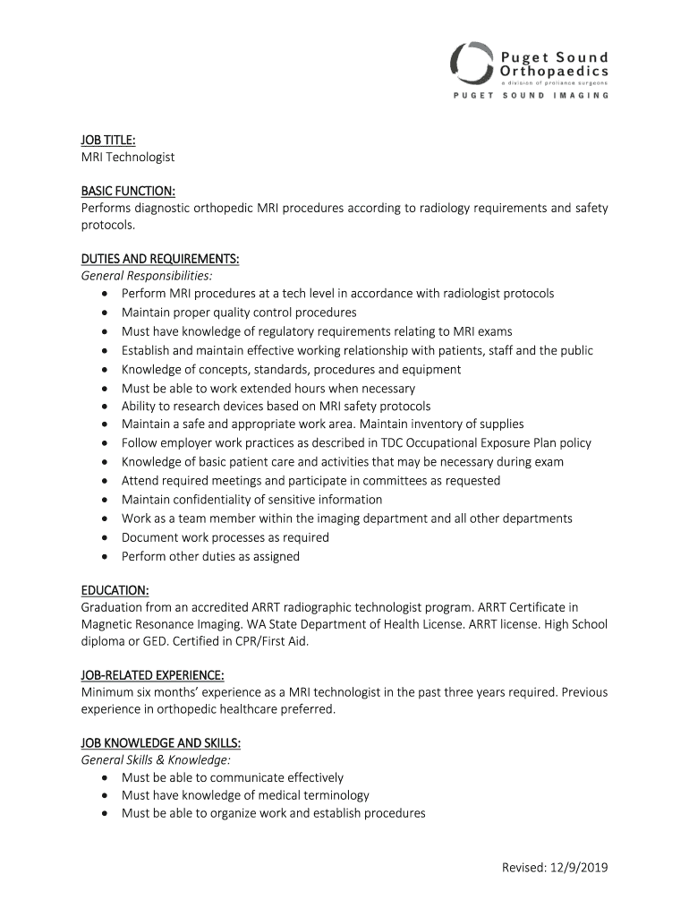 JOB TITLE: MRI Technologist BASIC FUNCTION: Performs diagnostic orthopedic MRI procedures according to radiology requirements and safety protocols. DUTIES AND REQUIREMENTS: General Responsibilities: