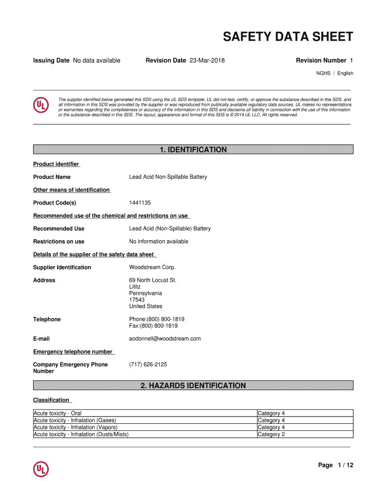 SAFETY DATA SHEET Issuing Date No data availableRevision Date 23Mar2018Revision Number 1 NHS / English The supplier identified below generated this SDS using the UL SDS template. UL did not test,