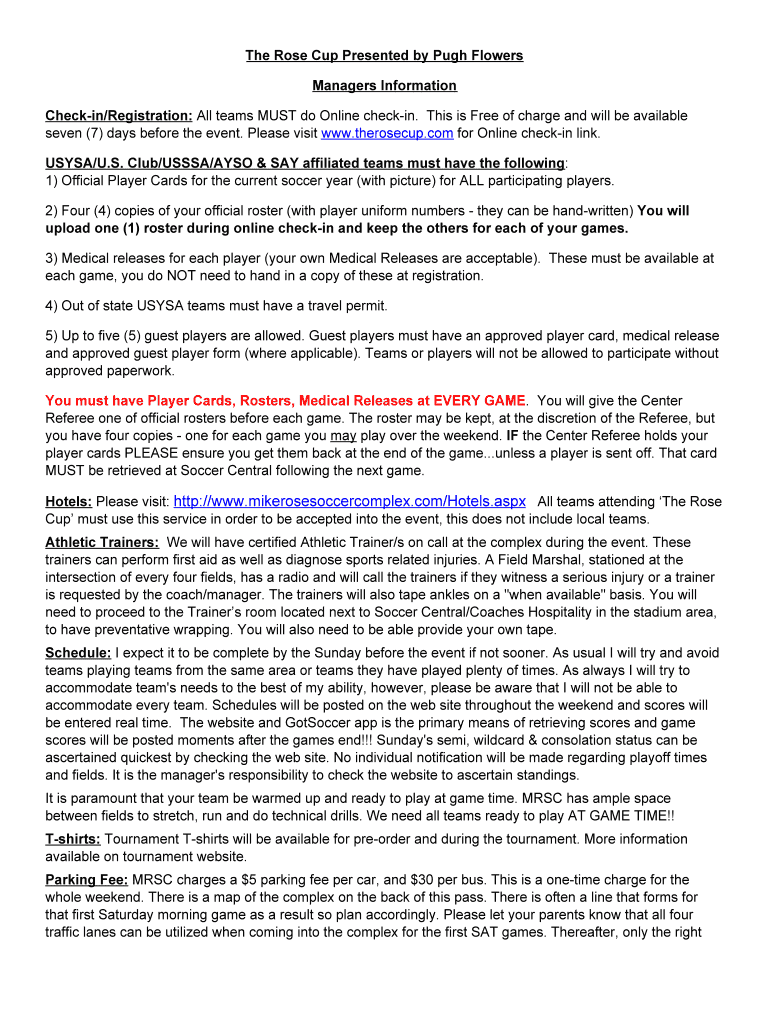 The Rose Cup Presented by Pugh Flowers Managers Information Checking/Registration: All teams MUST do Online checking. This is Free of charge and will be available seven (7) days before the event.