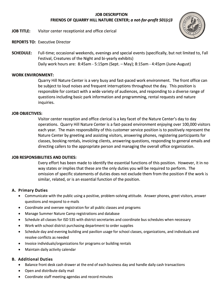 JOB DESCRIPTION FRIENDS OF QUARRY HILL NATURE CENTER; a notforprofit 501(c)3 JOB TITLE:Visitor center receptionist and office clericalREPORTS TO: Executive Director SCHEDULE:Full time; occasional