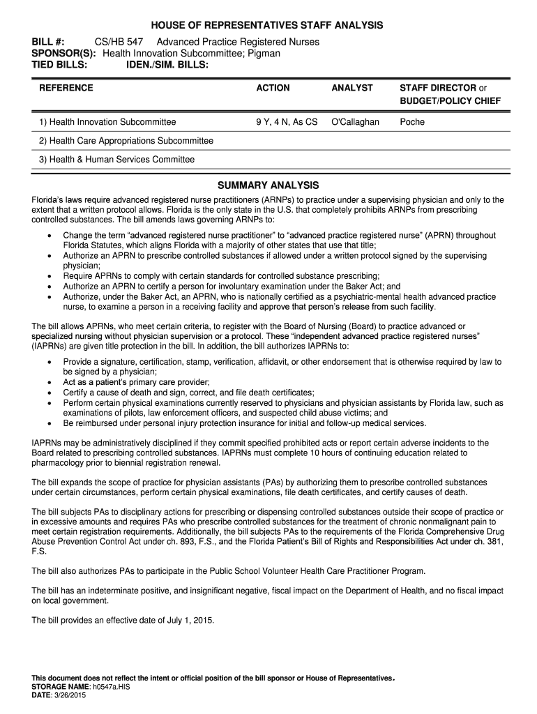 HOUSE OF REPRESENTATIVES STAFF ANALYSIS BILL #: CS/HE 547 Advanced Practice Registered Nurses SPONSOR(S): Health Innovation Subcommittee; Pig man TIED BILLS: IDEA./SIM. BILLS: REFERENCEACTIONANALYSTSTAFF